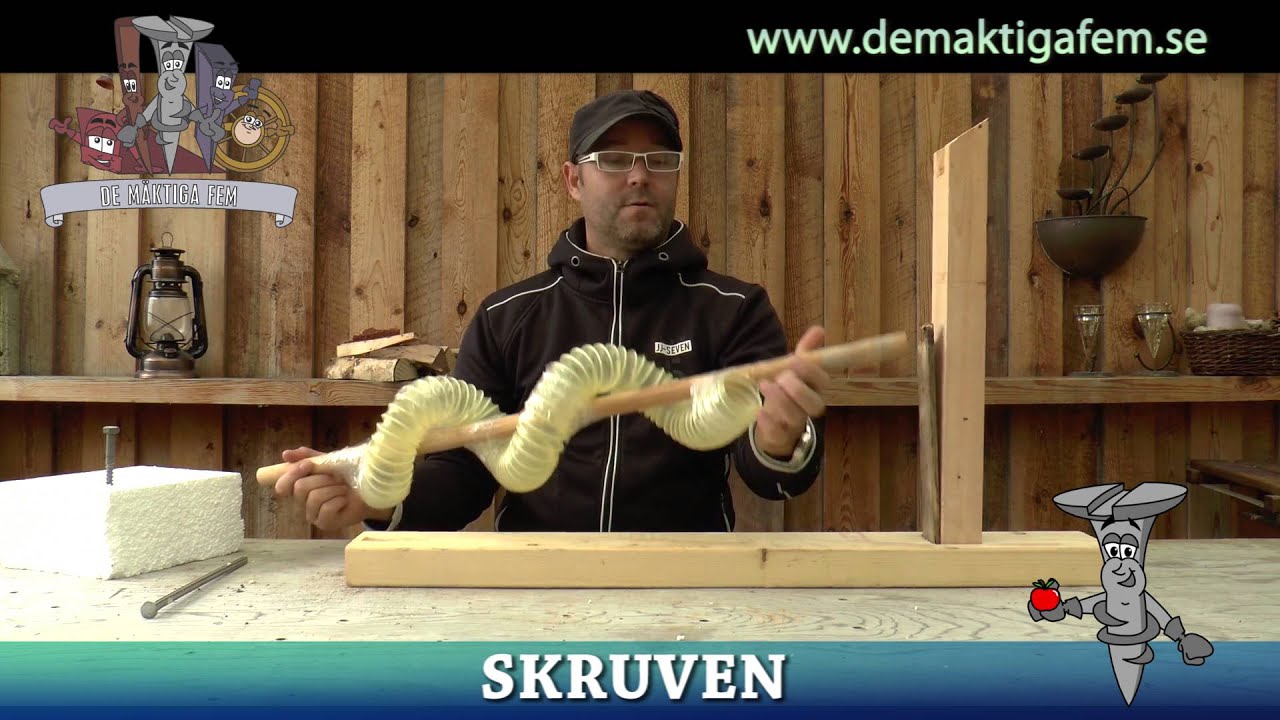 HOW WHEn De mäktiga fem WHY Skruven Skruven är ett hjälpmedel tex om man vill sätta ihop saker med varandra. De mäktiga fem Kilen Används för att dela Yxa delar vedträn Det man vinner i kraft förolorar man i väg Skruven. Följ länken nedan för att komma till deras hemsida.